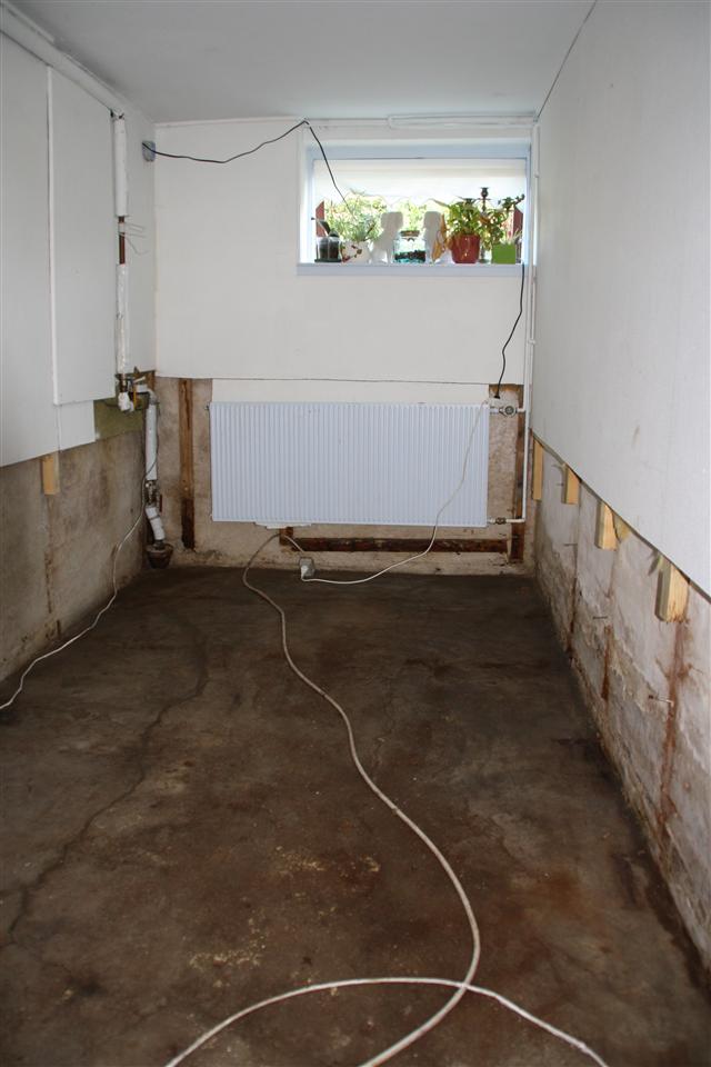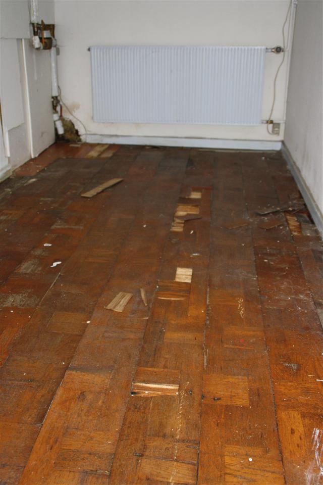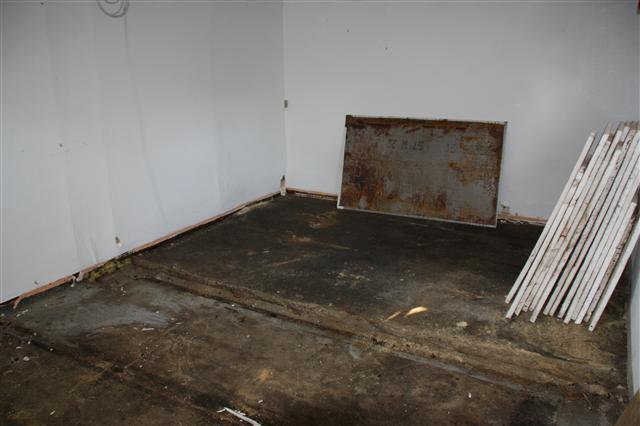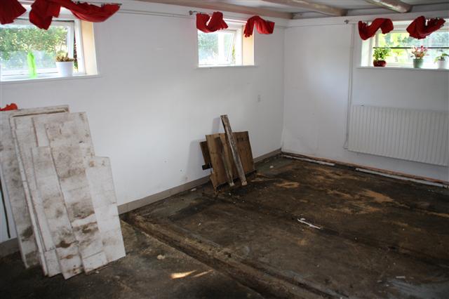 Trægulv er flået af, og de nederste 80 cm af væggene fjernet...
